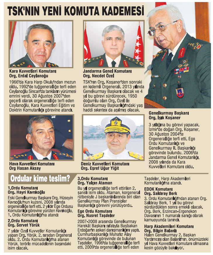 A, B VE C PLANLARI: Genelkurmay Karargahı, Başbakan Tayyip Erdoğan'ın Kara Kuvvetleri Komutanlığı için Org. Hasan Iğsız ismine soğuk bakması üzerine A, B ve C planları geliştirdi. Önce Org. Iğsız konusunda ısrar edildi. Bu ısrar hem Cumhurbaşkanı Gül hem de Başbakan Erdoğan'a iletildi ancak kabul görmedi. Jandarma Genel Komutanı Org. Atila Işık'ın emekliliğini istemesiyle bu defa B planı devreye girdi. Org. Başbuğ, Kara Kuvvetleri için Org. Necdet Özel'i, Jandarma Genel Komutanlığı için de Org. Aslan Güner'i önerdi. Bu öneri Başbakan Erdoğan ve Cumhurbaşkanı Gül tarafından kabul edilmedi.