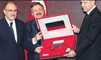 Emniyet Teşkilatı, askerlikten muaf tutan düzenleme nedeniyle teşekküre geldikleri Başbakan Recep Tayyip Erdoğan'a gönül borçlarını göstermek için bir de hediye verdi. "Tuğralı tabanca" olarak literatüre geçen hediyeyi Başbakan Erdoğan'a İçişleri Bakanı Beşir Atalay'la birlikte Emniyet Genel Müdürü Oğuz Kağan Köksal sundu. Köksal, Erdoğan'a verilen tabancanın, polis teşkilatında ilk kez kullanılan örneklerden olduğunu söyledi. 1903'te üretimine başlanan tabanca, üzerinde tuğra olduğu için "tuğralı tabanca" olarak biliniyor. Emniyet Teşkilatı, 1903 öncesinde toplu silah kullanıyordu. Bu arada Köksal, yönetmelikte değişiklik yapıldığını, teşkilata katkı sunanlara onur kimliği verileceğini söyledi. Köksal, ilk onur kimliğini Erdoğan'a verdi. Erdoğan'a bir de kokart sunuldu. Köksal, Erdoğan'a tabancayı sunarken, kendilerine verdiği destekten ötürü teşekkür de etti.