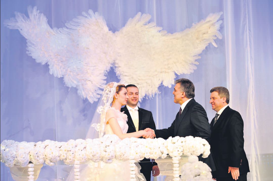 Cumhurbaşkanı Abdullah Gül ve Makedonya Cumhurbaşkanı Gjorge Ivanov dün işadamı İbrahim Cevahir'in oğlu Eser Cevahir ile Ebru Gizem Köseoğlu'nun nikâh töreninde şahitlik yaptı. Cevahir Holding Yönetim Kurulu Başkanı İbrahim Cevahir ve eşi Fatma Cevahir'in oğlu Eser Cevahir ile Ahmet ve Bilgi Köseoğlu'nun kızı Ebru Gizem Köseoğlu, dün akşam Grand Cevahir Otel'de düzenlenen törenle evlendi. Beyoğlu Belediye Başkanı Ahmet Misbah Demircan'ın kıydığı nikâhta çiftin şahitliklerini Cumhurbaşkanı Gül ile Makedonya Cumhurbaşkanı Ivanov yaptı. Melek detaylarıyla süslenen balo salonundaki nikâhın kıyılmasının ardından Gül çifti tebrik edip mutluluklar diledi. Evlilik cüzdanını geline veren Cumhurbaşkanı Gül, aile cüzdanını her zaman gelinlere verdiğini belirterek, "Çünkü ihtiyaç olduğunda o en kolay şekilde bulur" dedi. Gül şunları söyledi: "Değerli dostum Makedonya Cumhurbaşkanı Sayın İvanov ile birlikte Ebru ve Eser'in nikâh şahidi olmaktan büyük bir mutluluk duyuyoruz. İnşallah güzel bir aile olacaksınız. Bu güzel aileden güzel evlatlarınız olacak. Vatana, millete, herkese güzel, hayırlı işler yapacaklar. Cenab-ı Allah ömür boyu saadet versin." Gül'ün "Dostum" diyerek mikrofonu uzattığı Ivanov da, "Bu güzel ortamda sizlerle birlikte olmak bana ayrı bir gurur vermektedir. Gençleri kutluyorum" diye konuştu. Düğüne, Makedonya Cumhurbaşkanı Gorge Ivanov'un eşi Maya İvanov, Başbakan Yardımcısı Bülent Arınç, Avrupa Birliği Bakanı ve Başmüzakereci Egemen Bağış, Gümrük ve Ticaret Bakanı Hayati Yazıcı, Makedonya Ulaştırma Bakanı Mile Janakievsk, İstanbul Valisi Hüseyin Avni Mutlu, İstanbul Emniyet Müdürü Hüseyin Çapkın ve Çalık Holding Yönetim Kurulu Başkanı Ahmet Çalık da katıldı. Sanatçı Orhan Gencebay ve eşi Sevim Emre'nin de aralarında bulunduğu bin 600 davetlinin katıldığı törende Hadise, Sinan Özen ve İsmail Türüt de şarkılarıyla sahne aldı. Hasan AY/ SABAH