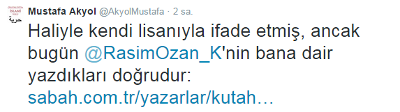 Yurtdışında bulunan Akyol son tweetinde "Haliyle kendi lisanıyla ifade etmiş, ancak bugün @RasimOzan_K'nin bana dair yazdıkları doğrudur" diyerek tartışmaya son noktayı koydu.