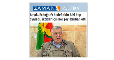 Zaman Genel Yayın Yönetmeni Ekrem Dumanlı bugünkü yazısında "PKK-Cemaat işbirliği en büyük iftiradır" derken Zaman gazetesinin internet sitesi KCK yöneticisi Cemal Bayık'ın AK Parti iktidarını ve çözüm sürecini hedef alan sözlerine geniş yer verildi. Erdoğan ve AK Parti iktidarını devirmek için PKK propagandası yapmaktan çekinmeyen paralel medya, PKK bayrağı kullanma yasağını da kaldırarak bir ilke imza attı. PKK-Paralel yapı işbirliğini gözler önüne seren haberde KCK'lı Bayık üzerinden AK Parti iktidarı ve Cumhurbaşkanı Erdoğan'a tehditler savruluyor. Her cümlesi sabotaj ve PKK propagandası kokan bu haberin yayınlandığı gün Ekrem Dumanlı'nın "PKK-Cemaat işbirliği en büyük iftiradır" yazısının yayınlanması ise dikkat çekici bulundu