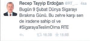 Cumhurbaşkanı Recep Tayyip Erdoğan, sosyal paylaşım sitesi Twitter'daki hesabından ilk paylaşımını 9 Şubat Dünya Sigarayı Bırakma Günü dolayısıyla yaptı. Erdoğan, "@RT_Erdogan" hesabından şu değerlendirmede bulundu: "Sigara, hem içen kişinin hem içildiği ortamdaki diğer masum bireylerin sağlığını tehdit eden sinsi bir zehirdir. Dünyada her yıl 6 milyon insan, sigara kullanımından, 600 bin kişi de sigara içmediği halde sigara dumanından dolayı hayatını kaybediyor. Sağlıklı nesiller için, ülkemizin aydınlık geleceği için sigara başta olmak üzere tüm zararlı alışkanlıkları hayatımızdan çıkaralım! Bugün 9 Şubat Dünya Sigarayı Bırakma Günü. Bu zehre karşı sen de iradene sahip ol ve sigaraya teslim olma."