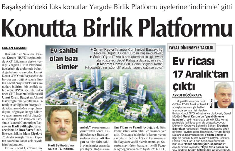 Gazetenin bugünki sayısında bazı hakim savcıların Emlak Konut GYO'nun Başakşehir'de hayata geçirdiği Ayazma Emlak Konut Projesinden indirimli şekilde lüks konut sahibi olduklarını iddia etti. Haberde ismi verilen ve Yargıda Birlik Platformu'na yakın oldukları belirtilen bazı hakim savcılara söz konusu projeden indirimli konut verildiği iddia edildi. Söz konusu haber hakim savcıların büyük tepkisini çekti. Projeden kimseye özel indirim uygulanmadığını ve hakim savcılar arasında ayrım yapılmadığını belirten Hakim savcılar, Cumhuriyet Gazetesi'ne büyük tepki gösterdi.