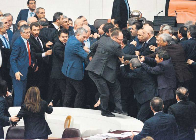 Sık sık tansiyonun yükseldiği görüşmelerde TBMM Başkanvekilleri Sadık Yakut ile Ayşe Nur Bahçekapılı nöbet değişimi yaptı. Bahçekapılı başkanlık divanına gelip masaya vuran MHP'lilere sert çıktı. TBMM kâtip üyesi AK Parti'li Mine Lök Beyaz önergeyi okurken MHP'liler su fırlattı. AK Parti ve MHP'liler arasında itişmeler yaşandı. AK Parti'li Metin Külünk ile Hilmi Bilgin düşmekten son anda kurtuldu. Milletvekilleri birbirlerinin tansiyonunu ölçtü. HDP'li vekiller ise toplumsal olaylarda poşu ile yüzün kapatılmasına verilen cezaların artırılmasını protesto etmek için yüzlerini poşu ile kapattı.