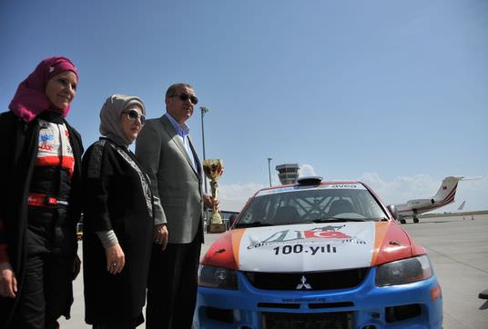 Erdoğan'ı taşıyan özel uçağın aprona yanaşmasıyla birlikte, milli rallici Burcu Çetinkaya, 2015 Türkiye Ralli Şampiyonası'nda yarıştığı otomobili ve şov otomobiliyle Erdoğan'ı apronda drift yaparak karşıladı.