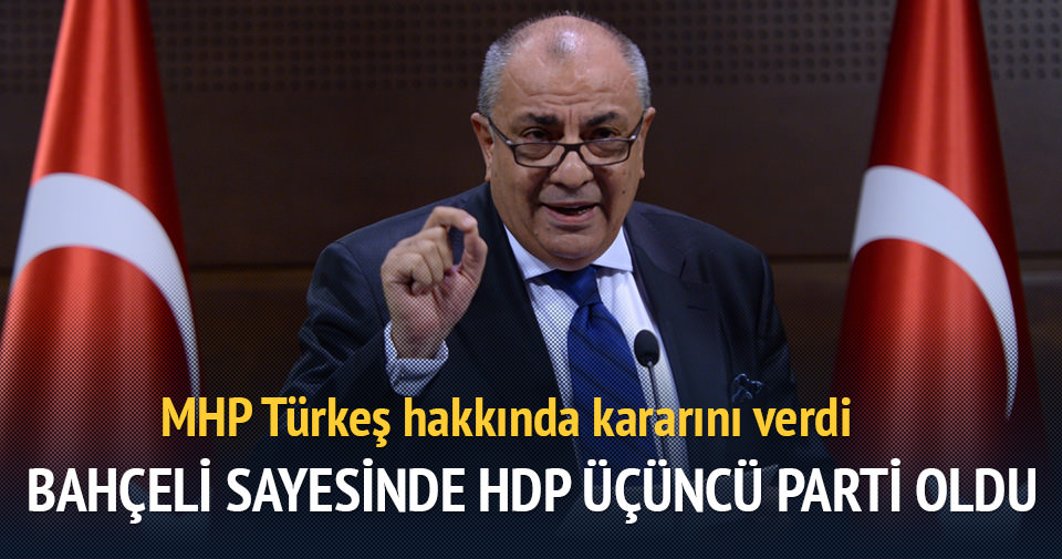Tuğrul Türkeş MHP'den ihraç edildi. MHP Merkez Disiplin Kurulu Tuğrul Türkeş'in partiden kesin ihracına karar verdi. Bu ihraç kararıyla HDP mecliste üçüncü parti oldu.