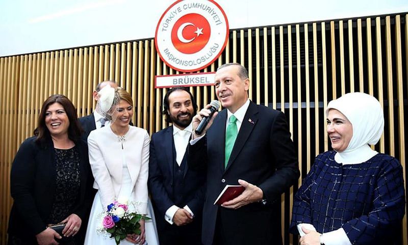 Erdoğan, Türkiye'nin Brüksel Büyükelçiliğinin yenilenen kançılarya binasının açılışı öncesi büyükelçilik binasındaki nikah merasimine katılarak Kanal Avrupa Genel Koordinatörü Seran Sargur ile iç mimar Eda Altunalev'ın nikahında şahitlik yaptı.