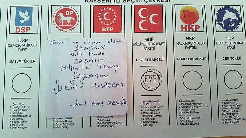 Bu arada Kayseri'de sandık başına giden ve MHP'ye oy veren bazı seçmenler, oy pusulası üzerinde bozkurt işareti yaparak ya da3 hilalli çakmak koyup fotoğraf çekerken, bazıları ise kâğıtlara notlar yazarak mesajlar verdi. Mesajlarda, 'Sonuç ne olursa olsun, yaşasın milli irade, yaşasın milliyetçi Türkiye, yaşasın Ülkücü hareket', '400 vekili, verilen şehitler unutmadık AKP, şimdi MHP vakti', 'Ülkücü şehit Fırat Yılmaz Çakıroğlu için, bir gece ansızın gelebiliriz' , 'Baki Başkanıma saygılarımla vurur yüze ifadesi oylar MHP'ye bitanesi' yazılı olduğu görüldü.