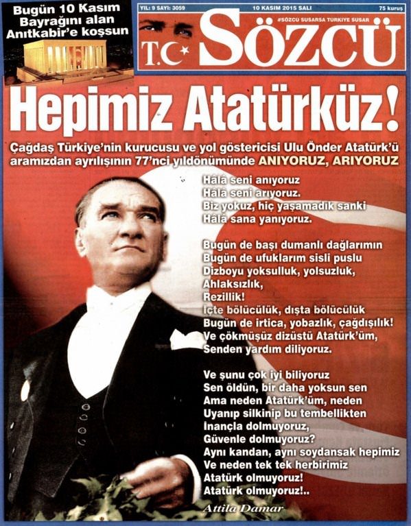 Sözcü gazetesi bugünkü sayısında "Hepimiz Atatürk'üz" manşetiyle çıktı. "Çökmüşüz dizüstü, senden yardım istiyoruz Atatürk'üm" dizeleri bir anda sosyal medyada çok konuşulan konular arasında kendine yer buldu.