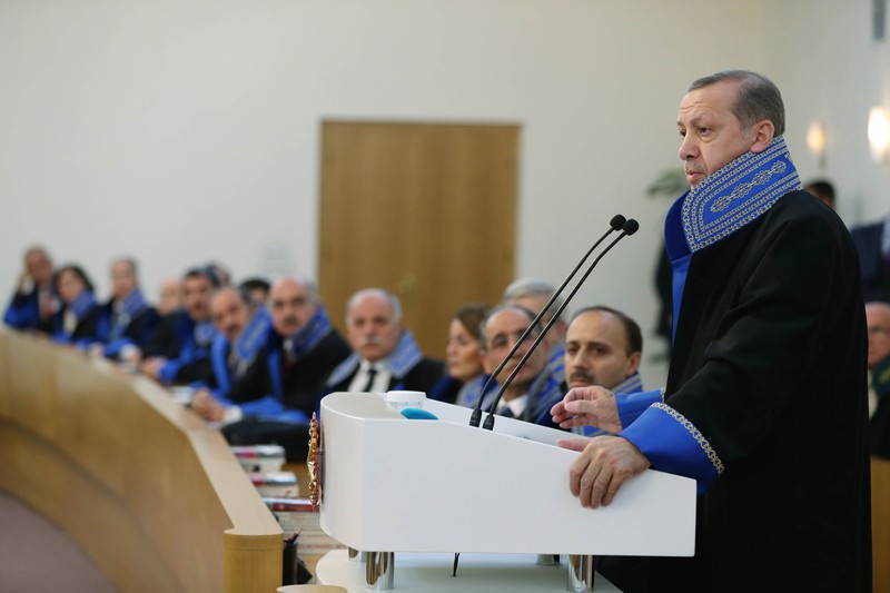 Akyel'in takdimiyle "Sayıştay cübbesi" giyen Cumhurbaşkanı Erdoğan, açılış konuşmasını yapan Recai Akyel'in ardından, Genel Kurula hitap etti.
