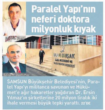Samsun Büyükşehir Belediye Başkanı Yusuf Ziya Yılmaz'ın, Paralel Yapı'ya yakın olduğu belirtilen Dr. Ersin Yılmaz'a yeniden ihale vermesi Cumhuriyet Başsavcılığı'nı harekete geçirdi. SABAH'TA çıkan "Paralel doktora bir kıyak daha" haberinin ardından harekete geçen Cumhuriyet Başsavcısı Erol Tosun, "Haberi ihbar kabul ettiğimiz için acilen soruşturma başlatılmasına karar verdik. Ayrıca Dr. Ersin Yılmaz'ın Paralel Yapı bağlantıları araştırılacak. 2007'den bugüne kadarki ihalelerde haksız rekabet varsa bunların hepsi araştırılacak" diye konuştu. Samsun Valisi İbrahim Şahin de başsavcılık ve valiliğin konuyu yakından takip ettiğini belirtip, "Komple bir çalışma başlatıldı. Bazı rektör adayları ile ilgili de çalışma yapılacak" dedi.