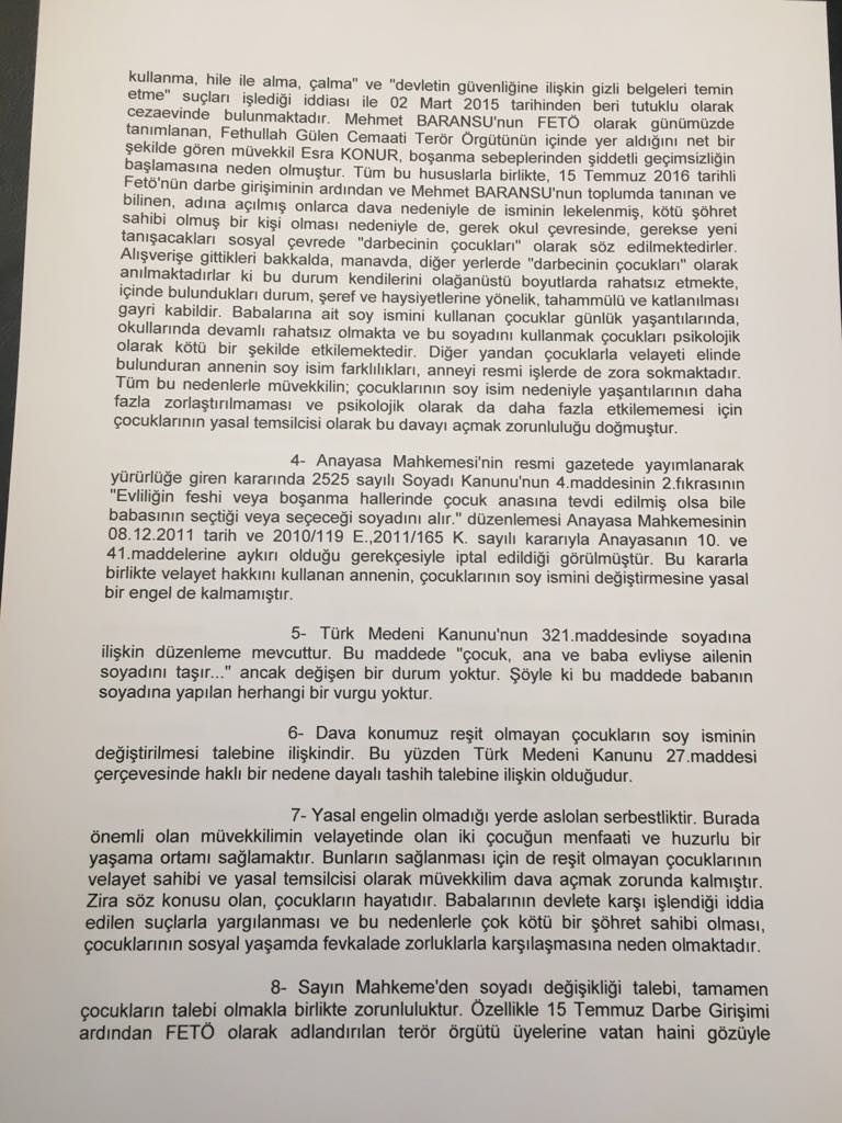 Avukat Murat Sultansu, dava dosyasında Mehmet Baransu'nun çocukları H.B.B. (11) ile D.B.B.'nin (5) kendi istekleriyle böyle bir karar aldıkları yönünde belge sunduklarını belirtti. Çocukların bu gelişme üzerine yasal temsilcileri olan anneleri Esra Konur ile birlikte mahkemeye başvurarak 'Baransu' soyadlarının 'Konur' olarak değiştirilmesini talep ettiğini ifade eden Murat Sultansu, davanın birkaç ay içinde sonuçlanabileceğini sözlerine ekledi.
