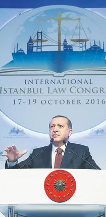 Cumhurbaşkanı Recep Tayyip Erdoğan Cumhurbaşkanlığı himayesinde Adalet Bakanlığı koordinatörlüğünde İstanbul Çırağan Sarayı'nda dün düzenlenen Uluslararası İstanbul Hukuk Kongresi'ne katıldı. Erdoğan'ın burada yaptığı konuşmasından satırbaşları şöyle: