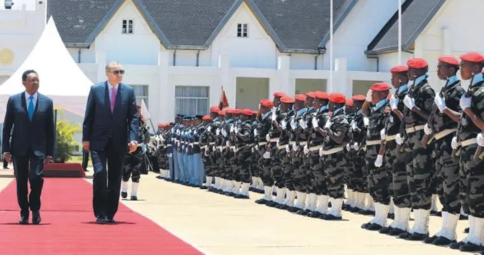 Cumhurbaşkanı Recep Tayyip Erdoğan, Afrika turunun son durağı Madagaskar'da, dün Cumhurbaşkanı Hery Rajaonarimampianina tarafından resmi törenle karşılandı. Karşılama töreninde, Cumhurbaşkanı Erdoğan'ın eşi Emine Erdoğan, Dışişleri Bakanı Mevlüt Çavuşoğlu, Ekonomi Bakanı Nihat Zeybekci, Enerji ve Tabii Kaynaklar Bakanı Berat Albayrak ile Cumhurbaşkanlığı Genel Sekreter Yardımcısı ve Sözcüsü İbrahim Kalın da hazır bulundu. Cumhurbaşkanı Erdoğan ve Rajaonarimampianina, karşılamanın ardından baş başa ve heyetler arası görüşmelere başladı. Madagaskar Cumhurbaşkanı Hery Rajaonarimampianina, Türkiye'de teröre karşı yürütülen mücadeleyi bildiklerini belirterek "Düşmanlarla savaşırken sizin yanınızdayız" dedi. Rajaonarimampianina, uluslararası ilişkilerde "kazan kazan" politikasına önem verdiklerini dile getirerek şöyle devam etti: "Ülkemizde yap-işlet-devret modelini uygulayabiliriz. Türkiye'de bunun güzel örnekleri olduğunu görüyoruz. Enerji ve eğitim alanında da önemi adımlar atılmasını kararlaştırdık. Malgaş halkı Türk halkının yanındadır."
