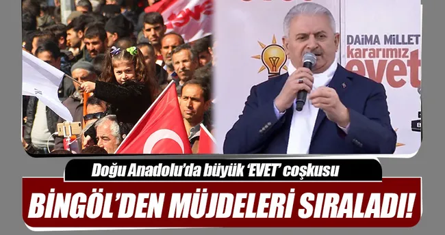AK Parti Genel Başkanı ve Başbakan Yıldırım, anayasa değişikliğine ilişkin halk oylaması sürecinde, partisinin 15 Temmuz Demokrasi Meydanı'ndaki mitinginde yaptığı konuşmaya, Bingöl'ün ilçelerini tek tek sayarak ve vatandaşları selamlayarak başladı.
