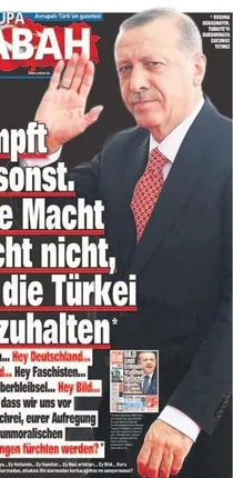 Alman Bild gazetesinin Türkiye ve Erdoğan'ı hedef alan küstah ve ırkçı manşetine ses çıkarmayan ikiyüzlü Almanya, o gazeteye manşetten tokat gibi yanıt veren SABAH hakkında soruşturma başlattı. Alman BILD gazetesi geçtiğimiz 15 Mart'ta "Bild gerçeği Erdoğan'ın yüzüne söylüyor: Demokrat değilsiniz! Burada istenmiyorsunuz!" başlıklı haberiyle ırkçı ve faşist yüzünü bir kez daha gösterdi. O habere 16 Mart'ta karşılık veren SABAH Avrupa ise "Ey Avrupa... Ey Almanya... Ey Hollanda... Ey faşistler... Ey Nazi artıkları... Ey Bild... Kuru gürültünüzden, yaygaralarınızdan, ahlaksız iftiralarınızdan korkacağımızı mı sanıyorsunuz?" başlığı ile ırkçı gazeteye tokat gibi yanıt verdi.