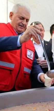 Kıldığı cuma namazının ardından cami bahçesinde kurulan Türk Kızılayı standına geçerek yelek giyen Yıldırım, hazırlanan aşureyi vatandaşlara dağıttı.