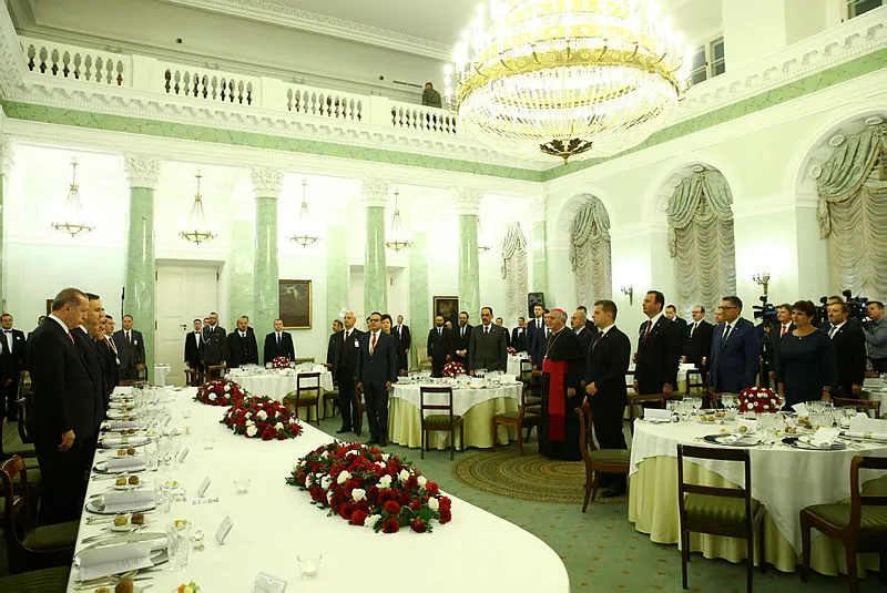 Cumhurbaşkanı Recep Tayyip Erdoğan, çeşitli temaslarda bulunmak üzere geldiği Varşova'da Polonya Cumhurbaşkanı Andrzej Duda tarafından onuruna verilen akşam yemeğine katıldı. Polonya Cumhurbaşkanlığı Sarayı'ndaki yemek basına kapalı gerçekleştirildi.