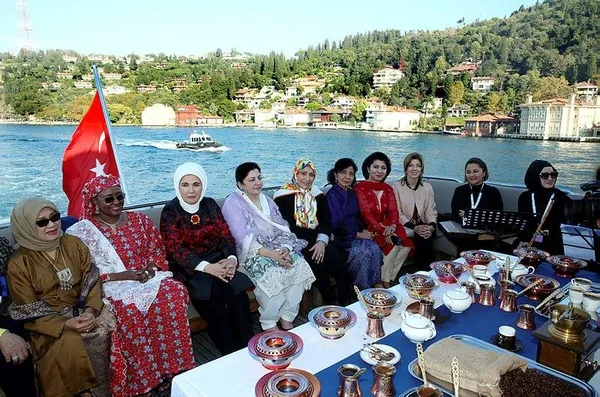 Emine Erdoğan, liderlerin eşlerini teknede ağırladı.