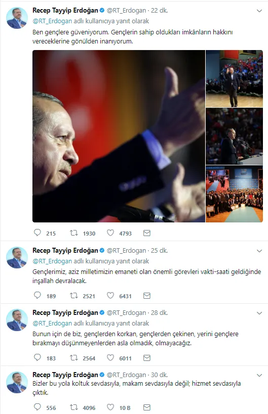 Cumhurbaşkanı Erdoğan'ın dört paylaşımının her biri ilk saniyelerde 4 binin üzerinde beğeni alırken, "Bizler bu yola koltuk sevdasıyla, makam sevdasıyla değil, hizmet sevdasıyla çıktık." paylaşımının 8 bin beğeni alması dikkati çekti.