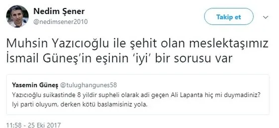 Yasemin Güneş'in tweetini paylaşarak tepsinine dikkat çeken gazeteci Nedim Şener küfür eden 'İyi partililere' ise böyle cevap verdi.