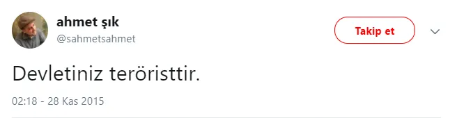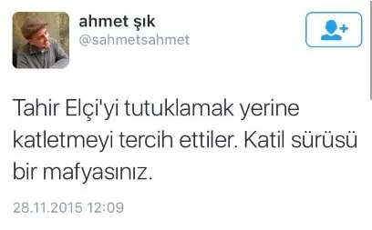 Sosyal medya platformu Twitter'daki hesabından 'Devletiniz teröristtir', 'Tahir Elçi'yi tutuklamak yerine katletmeyi tercih ettiler. Katil sürüsü bir mafyasınız ve katil devlettir deyince bozuluyorsunuz' şeklindeki paylaşımları sebebiyle hakkında soruşturma yürütülen Cumhuriyet Gazetesi muhabiri Ahmet Şık hakkında iddianame düzenlendi.