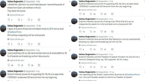 Dondurma satan FETÖ'cü Erol Kozcuoğlu'nun kimliğinin deşifre olmasının ardından örgütün tetikçileri harekete geçti. Sosyal paylaşım sitesi Twitter'da görüntüleri paylaşan Vakkas Doğantekin'in hesabına tehdit mesajları yağdı. Yaptığının hesabının sorulacağını yazan FETÖ'cüler Doğantekin'in telefon numarasını da ele geçirerek ölüm tehditlerini sürdürdü. Yaşananların detaylarını Twitter'dan paylaşan Doğantekin hayati tehlikesinin bulunduğunu açıkladı. Terör örgütünün hedefi olan Doğantekin polise giderek şikâyetçi oldu.