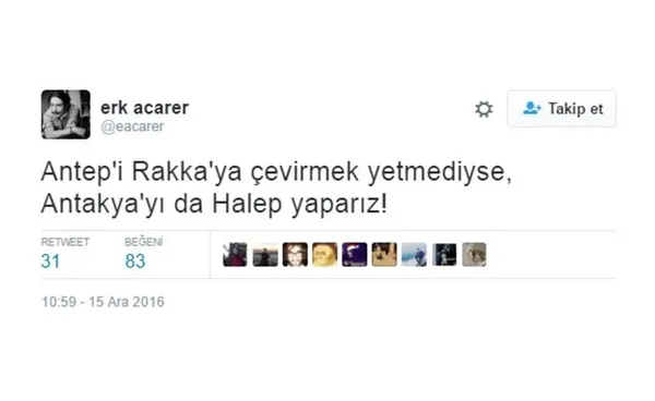 Katil Esed rejiminin Halep halkını ablukaya alarak katliamlara başladığı bir dönemde Antakya'yı Halep'e çevirmekle Türkiye'yi tehdit etme cüreti de gösteren Acarer, büyük tepki toplamıştı.