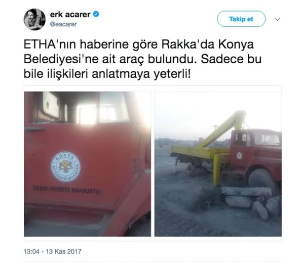 Türkiye aleyhine yaptığı provokasyonlar ve nefret söylemleriyle sık sık gündeme gelen Birgün muhabiri Erk Acarer, Rakka'da Konya Belediyesine ait iş makinesi bulunduğunu iddia etti ve Türkiye'nin DEAŞ'a destek verdiği yalanına sarıldı.