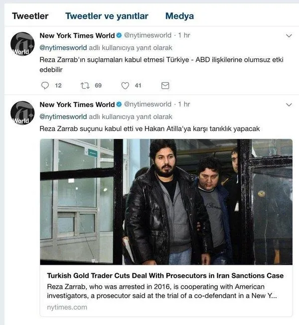 Türkiye'ye yönelik ekonomik darbe girişimine medya da destek veriyor. Operasyonel ve yalan haberlerle Türkiye aleyhinde algı yaratmaya çalışılıyor. Amerikan New York Times kumpas davasına Türkçe tweetlerle katıldı. Daha önce FETÖ elebaşı Fetullah Gülen'i "karizmatik vaiz" olarak lanse eden New York Times, ABD'deki davayla ilgili Türkçe tweetler attı. 'Reza Zarrab suçunu kabul etti ve Hakan Atilla'ya karşı tanıklık yapacak. Reza Zarrab'ın suçlamaları kabul etmesi Türkiye ABD ilişkilerine olumsuz etki edebilir.' diye Türkçe tweetler attı. Başka bir dilde tweet atmayan NYT'nin Türkiye aleyhinde Türkçe tweetler atmasıyla kirli operasyon bir kez daha gözler önüne serildi.