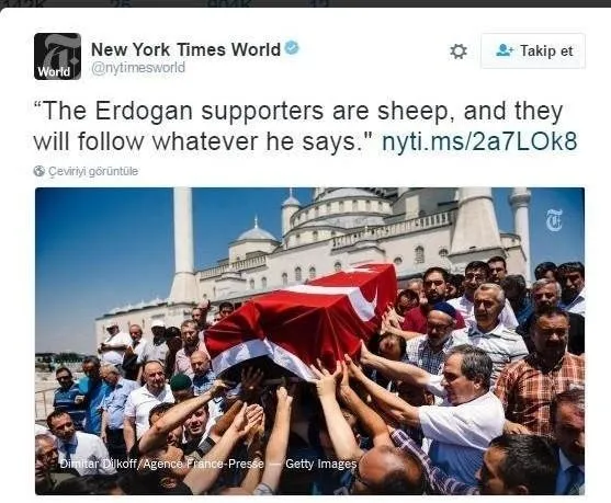 NYT'nin Türkiye düşmanlığında sabıkası kabarık. Daha önce Türkiye DEAŞ'a yardım ediyor yalanını ortaya atmıştı. 15 Temmuz darbe girişiminin ardından ise New York Times, sosyal medya hesabından Türk seçmene "koyun" demişti. Gazete, başarısızlıkla sonuçlanan darbe girişimine dair yayımladığı analizini Twitter hesabından "Erdoğan takipçileri koyundur ve Erdoğan kendilerine ne söylerse onu yaparlar" alıntısıyla paylaşmıştı.