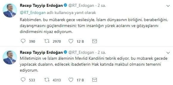 Cumhurbaşkanı Recep Tayyip Erdoğan Twittter hesabından yayınladığı mesajda, "Milletimizin ve İslam âleminin Mevlid Kandilini tebrik ediyor, bu mübarek gecede yapılacak duaların, edilecek ibadetlerin Hak katında makbul olmasını temenni ediyorum" diye yazdı.