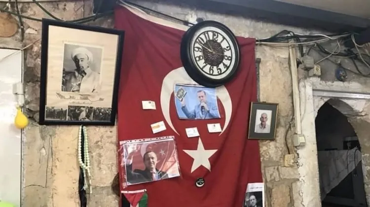 Kudüs'te görülen evde Türk Bayrağı, Cumhurbaşkanı Erdoğan'ın fotoğrafları, Filistin Bayrağı evin dış mahfiline asılmış ve hala Türkleri bekliyorlar.