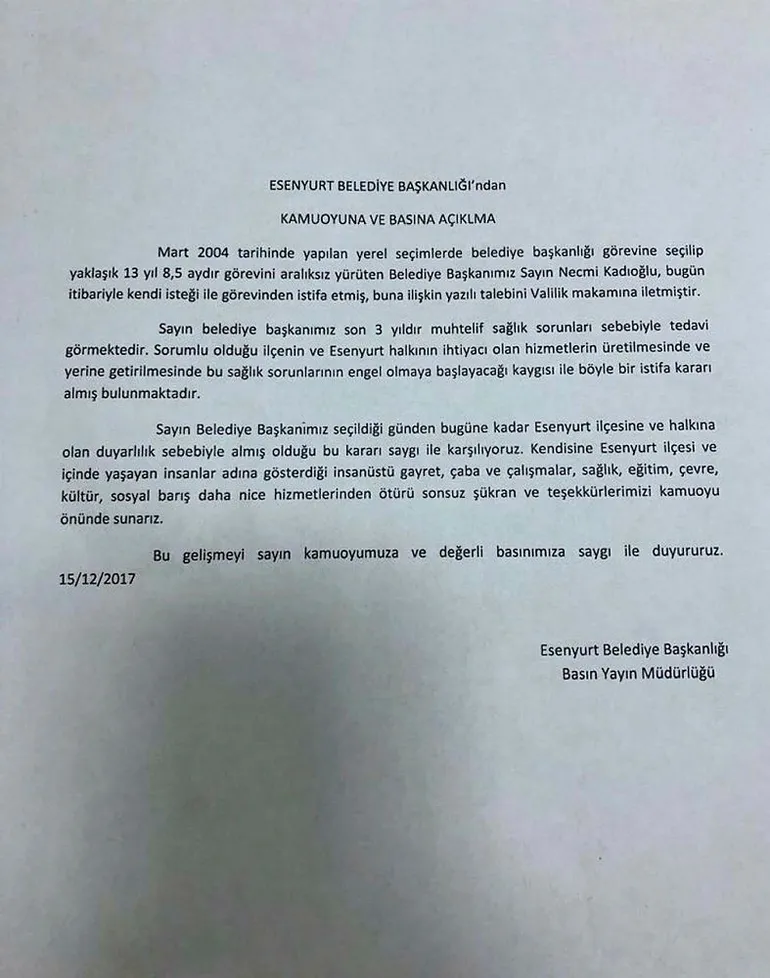 "Sorumlu olduğu ilçenin ve Esenyurt halkının ihtiyacı olan hizmetlerin üretilmesinde ve yerine getirilmesinde bu sağlık sorunlarının engel olmaya başlayacağı kaygısıyla böyle bir istifa kararı almış bulunmaktadır. Sayın Belediye Başkanımızın, seçildiği günden bugüne kadar Esenyurt ilçesine ve halkına olan duyarlılık sebebiyle almış olduğu bu kararı saygıyla karşılıyoruz. Kendisine Esenyurt ilçesi ve içinde yaşayan insanlar adına gösterdiği insanüstü gayret, çaba ve çalışmalar, sağlık, eğitim, çevre, kültür, sosyal barış daha nice hizmetlerinden ötürü sonsuz şükran ve teşekkürlerimizi kamuoyu önünde sunarız."