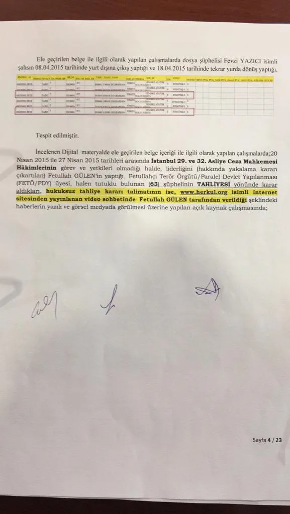 İstanbul Cumhuriyet Başsavcısı İrfan Fidan Yazıcı'nın evinde bulunan belgelerle ilgili, 'Evinde ele geçirilen dijital materyellerde, örgütün ''Salıverme kumpasına'' ilişkin terörist başı Fetullah Gülen'in örgüt mensuplarına verdiği en somut talimat belgesi ortaya çıktı. Bu talimatı alan örgüt yöneticileri Mustafa Başer ve Metin Özçelik, tüm FETÖ üyesi şüphelileri ( 63 kişi ) 25 Nisan 2015 tahliye etmiştir. Bu şüpheliler arasında Hidayet Karaca, Ali Fuat Yılmazer, Nazmi Ardıç, Yurt Atayün Ömer Köse, Yasin Topçu ve sözde ABD'deki davada tanıklık yapan Hüseyin Korkmaz da bulunuyor. Bu usulsüz tahliye kararı, (aynı gece) İstanbul 10. Sulh Ceza Hakimliğince yok hükmünde sayılmış ve bu örgüt üyeleri tahliye edilmemiştir'dedi.