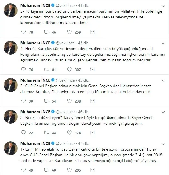 İnce, Twitter hesabından şu açıklamayı yaptı: "İzmir Milletvekili Tuncay Özkan katıldığı bir televizyon programında "1.5 ay önce CHP Genel Başkanı ile bir görüşme yaptığımı, o görüşmede 3-4 Şubat 2018 tarihinde yapılacak Kurultayımızda aday olmayacağımı açıkladığımı" söylemiş. Neresini düzelteyim? 1.5 ay önce böyle bir görüşme olmadı, Sayın Genel Başkan ile en son oğlumun düğün davetiyesini vermek için görüştüm.