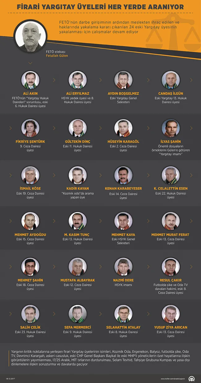 FETÖ'nün darbe girişimi sonrası Ankara Cumhuriyet Başsavcılığınca başlatılan soruşturma kapsamında, 18 Temmuz 2016'da haklarında gözaltı kararı verilen firari eski Yargıtay üyeleri Ali Akın, Ali Eryılmaz, Aydın Boşgelmez, Candaş İlgün, Fikriye Şentürk, Gültekin Dinç, Hüseyin Karagöl, İlyas Şahin, İsmail Köse, Kadir Kayan, Kenan Karabeyeser, Kuddusi Celalettin Esen, Mehmet Aydoğdu, Mehmet Kasım Tunç, Mehmet Kaya, Mehmet Murat Ferat, Mehmet Şahin, Mustafa Albayrak, Nazmi Dere, Resul Çakır, Salih Çelik, Sefa Mermerci, Selahattin Atalay ve Yusuf Ziya Arıcan'ın yakalanması için yaklaşık 17 aydır çalışmalar sürüyor.