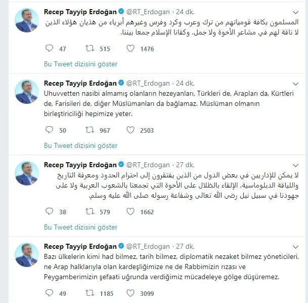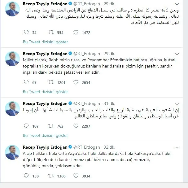 Cumhurbaşkanı Erdoğan'dan Türkçe ve Arapça tweet