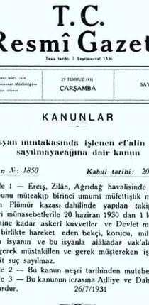 1931 yılında çıkartılan "İsyan mıntıkasında işlenen eskâlin suçu sayılmayacağına dair kanun" Erciş Zilan ve Ağrıdağ havalesinde meydana gelen isyana karşı direnen sivillerin de fiil ve hareketlerinin suç sayılmayacağının düzenleme altına alındığı ortaya çıktı.