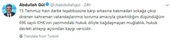 ABDULLAH GÜL SON KHK'LARLA İLGİLİ ŞU TWEETLERİ ATMIŞTI