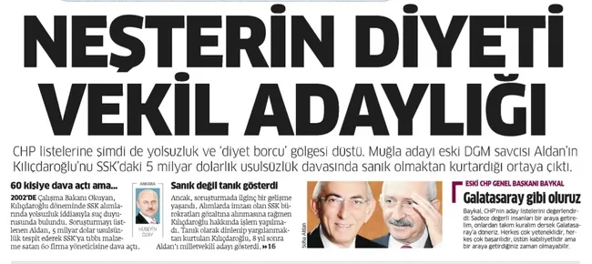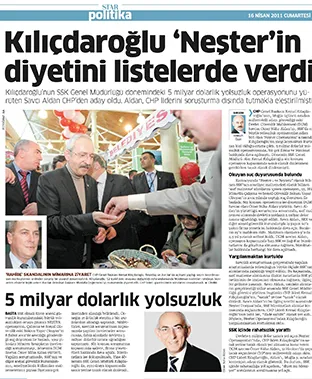Star gazetesinin 2011'deki haberinde, "Savcılık soruşturması çerçevesinde yapılan araştırmalarda yolsuzluğun büyük ölçüde SSK'nın alımlarında yapıldığı tespit edildi. Bu kapsamda, sarf malzeme alımlarına ilişkin kararlarda SSK yönetiminin de imzasının olmasına rağmen, ilginç bir gelişme yaşandı. Savcı Aldan, usulsüz alımların gerçekleştiği yıllar arasında SSK Genel Müdürlüğü görevini yürüten bugünün CHP lideri Kemal Kılıçdaroğlu'nu, "sanık" yerine "tanık" olarak dinledi. Savcı Aldan'ın bu ilginç tercihi sayesinde, Neşter Dosyası'nda, SSK bürokratları alımlar konusunda suçlanırken, CHP Lideri Kemal Kılıçdaroğlu'nun ismi ise, "ifade sahibi" olarak yer aldı. Böylece, Neşter Operasyonu'ndan Kılıçdaroğlu yargılanmaktan kurtulmuş oldu" diyordu.