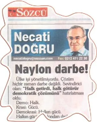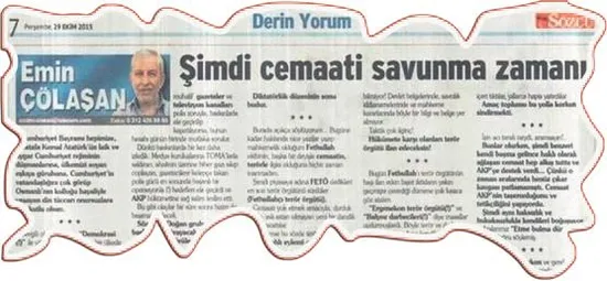 Emin Çölaşan, Sözcü'deki 29 Ekim 2015 tarihli 'Şimdi Cemaati Savunma Zamanı' başlıklı skandal yazısıyla işin boyutunu örgüt avukatlığına kadar taşırken Sözcü yazarı Necati Doğru ise kanlı darbe girişiminden sadece 2 gün sonra yayımlanan 'Naylon darbe' yazısında "Yoksa bu "tezgahlanmış bir darbe" miydi? Danışıklı dövüşten bir kalkışma mıydı?" diyerek vatan savunması için kan döken binlerce insana saygısızlık yaptı.