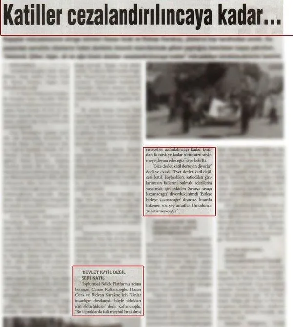 Sol gazete Atılım'da 24 Mayıs 2013 tarihinde çıkan haberde Canan Kaftancıoğlu'nun "devlet katil değil seri katil" sözlerine yer veriliyor. Toplumsal Bellek Platformu adına bir etkinlikte konuşan Kaftancıoğlu'nun o sözleri haberde şöyle yer aldı: