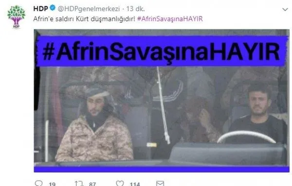 Hatay'ın Reyhanlı ve Kırıkhan ilçelerinde savaş uçağı seslerinin duyulduğu saatlerde HDP'nin resmi twitter hesabından "Afrin'e saldırı Kürt düşmanlığıdır. Kardeşlerimize saldırılmasını asla kabul etmiyoruz." tweeti atıldı.