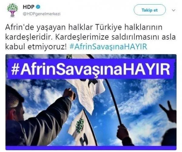 Afrin'de PKK'lılara yönelik operasyonunun başladığı saatlerde HDP, "Afrin'e saldırı Kürt düşmanlığıdır. Kardeşlerimize saldırılmasını kabul etmiyoruz." dedi.