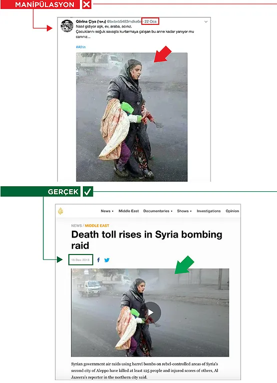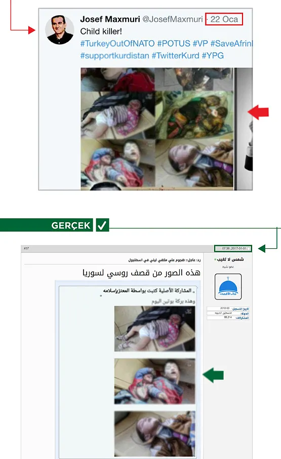 Sosyal mecralarda terör örgütüne yakın hesaplar tarafından Zeytin Dalı Harekatı'nı karalama amacıyla paylaşılan çok sayıda fotoğrafın, harekatla hiçbir ilgisi olmadığı ispatlanmıştı.