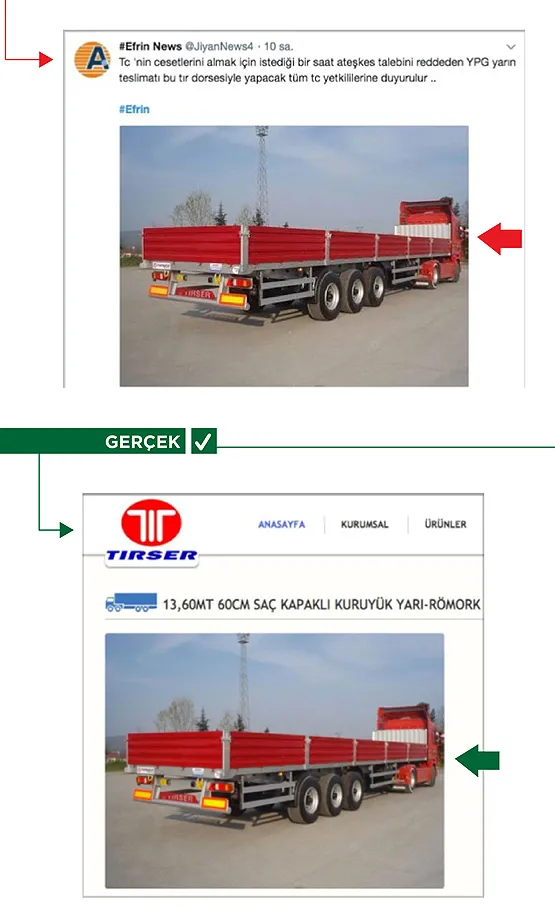 TSK'nın Suriye'nin kuzeybatısındaki Afrin bölgesinde, PKK/KCK/PYD-YPG ve DEAŞ'a yönelik yürüttüğü operasyon sırasında çekildiği iddia edilen 2 fotoğrafın daha gerçekle ilgisi olmadığı ortaya çıkarken, 1 fotoğrafın ise bir tır şirketinin tanıtım sayfasından alındığı belirlendi.