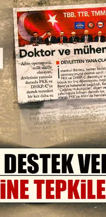 Sağlık Sen İzmir 2 No'lu Şube Başkanı Ekrem Özdemir de milli konularda, milletimizin ve temsil ettiği hekimlerin yanında duruş sergileyemeyen Türk Tabipler Birliği'nin yaptığı açıklamayla terörle mücadeleyi savaş olarak nitelendirdiğini belirterek, "Sağlık-Sen olarak söz konusu açıklamayı şiddetle ve lanetle kınıyor; terör ve terör örgütlerini destekleyici bu açıklamadan dolayı Cumhuriyet Savcılarımızı göreve çağırıyoruz" dedi.