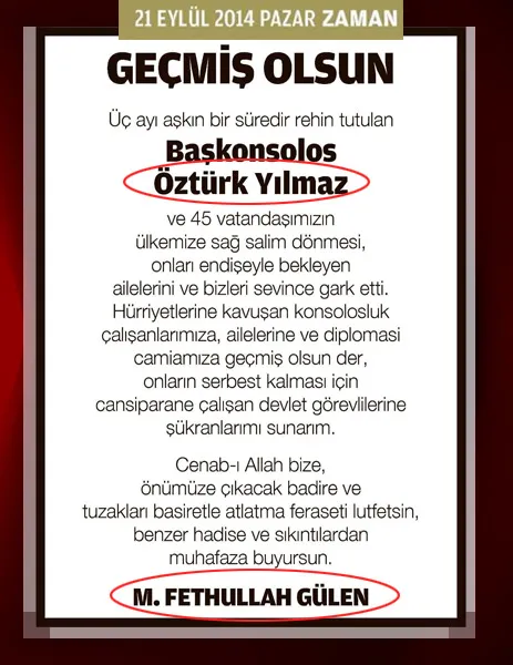 Bir de bu var.. 17 Aralık geçmiş.. FETÖ denilen aşağılık yapının devlete kastettiği çıkmış ortaya. Gülen denilen örgüt elebaşı devletin kırmızı kitabına girmiş. Ulusal güvenlik sorunu olarak devletin her kademesinde kabullenilmiş.. Gel gelelim kaçırılmadan bir hafta evvel örgütün kurmay kadrosuyla resim veren Muhasebeci Kenan, evine döndüğünde bir de Gülen'in geçmiş olsun temennisine mazhar olmuş.. Bay eski konsolos!.. Ne bu? Evine sağ salim dönüşüne yazılmış olan bu geçmiş olsun ilanı, nasıl bir hukukun sonucu acaba?..