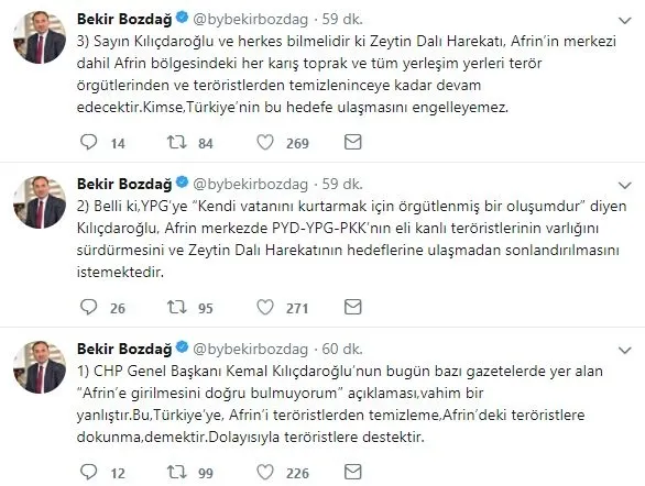 Başbakan Yardımcısı ve Hükümet Sözcüsü Bekir Bozdağ, "CHP Genel Başkanı Kemal Kılıçdaroğlu'nun bugün bazı gazetelerde yer alan 'Afrin'e girilmesini doğru bulmuyorum' açıklaması, vahim bir yanlıştır. Bu, Türkiye'ye, 'Afrin'i teröristlerden temizleme, Afrin'deki teröristlere dokunma', demektir. Dolayısıyla teröristlere destektir." ifadesini kullandı.